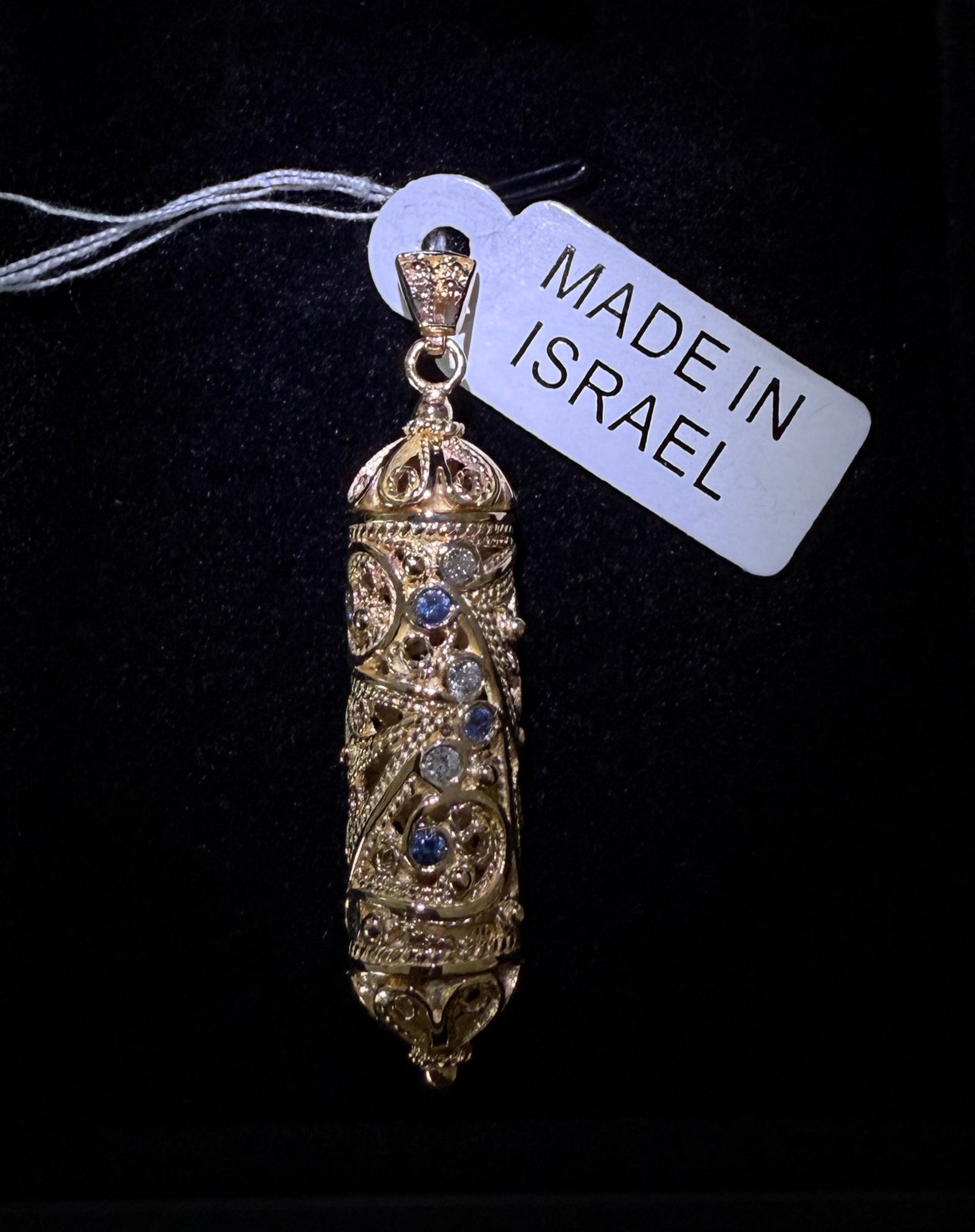 Mezuza en Oro 18 con diamantes y safira. Hecho en Israel
