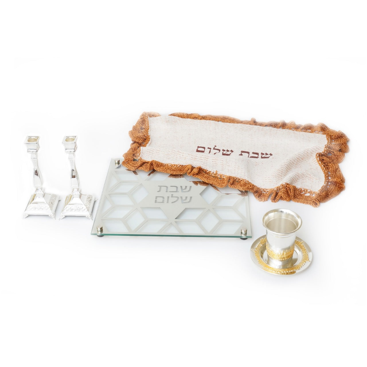 set shabat candelabros de niquel altura 17 cm bandeja metal calado y vidrio 30 x 26 cm